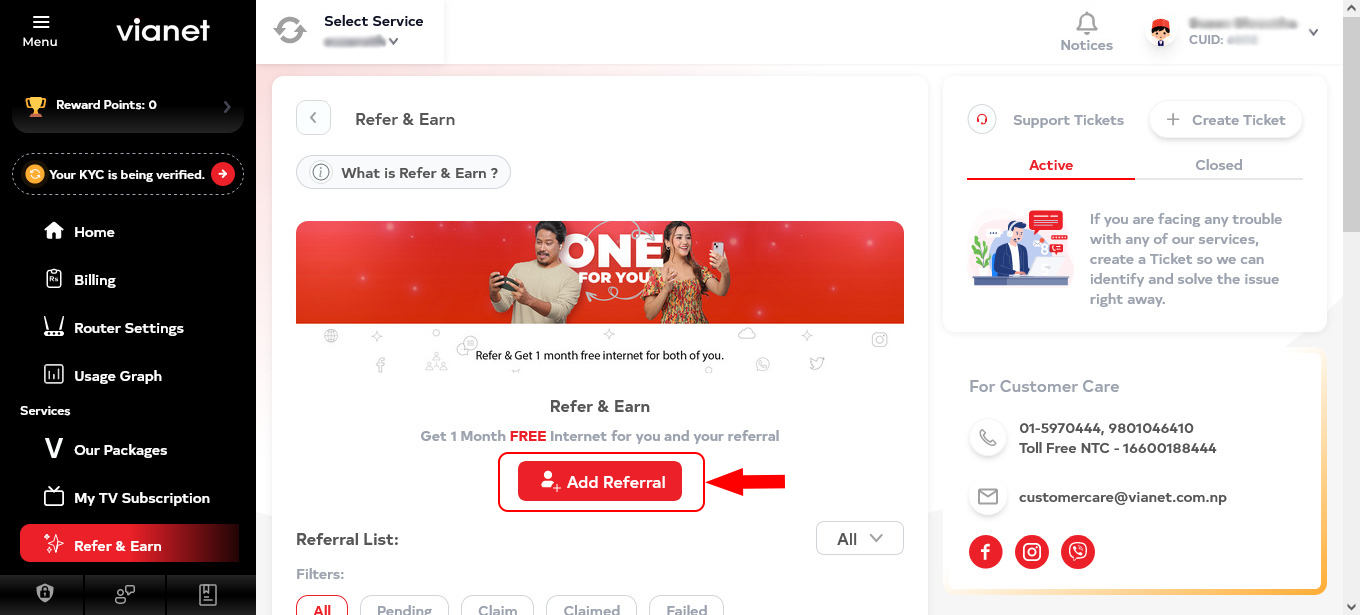 Simply login to Vianet Customer Web Portal or Vianet Mobile App and click on the “Refer & Earn” Link